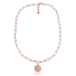 Naszyjnik Antique z monetą Naszyjnik w wyjatkowo modnym stylu to doskonały dodatek do Twojej kolekcji biżuterii. Wykonany jest ze srebra próby 925 i dodatkowo pokryty galwanicznie różowym złotem co gwarantuje najwyższą jakość. . Łańcuszek ma wyjątkowy splot, który nadaje mu elegancki wygląd i sprawia, że jest on nie tylko ozdobą, ale również wyrazem Twojego indywidualnego stylu. Najważniejszym i bardzo trendowym elementem tego naszyjnika jest srebrna moneta umieszczona na środku. ma starannie wytłoczony wzór, który dodaje wyjątkowego charakteru.