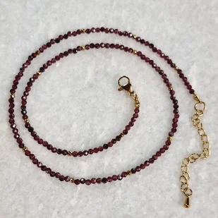 Naszyjnik wykonany z kamieni naturalnych na stalowej lince jubilerskiej, zakończony zapięciami ze stali szlachetnej. DŁUGOŚĆ CAŁKOWITA WRAZ Z ZAPIĘCIEM TO OK 40 CM PLUS ŁAŃCUSZEK PRZEDŁUŻAJĄCY OK 5 CM . *GRANAT (kulka fasetowana ok 2 mm) *HEMATYT ( kolor złoty ) * DŁUGOŚĆ NASZYJNIKA OK 40 CM + 5 CM ****** DOSTĘPNY RÓWNIEŻ W WERSJI KOLORYSTYCZNEJ SREBRNEJ ---> po zakupie napisz wersja srebrna : ) *** Nasze produkty są ręcznie robione, dlatego możemy zaproponować Tobie zamówienie niestandardowego rozmiaru czy modyfikacji. W zależności od Twoich potrzeb produkt może różnić się ceną oraz wydłużonym czasem realizacji.