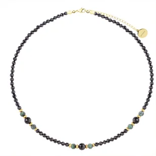 Ekskluzywny naszyjniki-choker, który łączy w sobie głębię fasetowanych czarnych turmalinów z subtelnością zielonych szmaragdów. Ten unikatowy naszyjnik został zaprojektowany z myślą o kobietach ceniących luksus i styl. Zielone szmaragdy dodają szlachetnego charakteru, tworząc wyrafinowany kontrast z czarymi turmalinami. Wykończenie z najwyższej jakości złoconej stali szlachetnej nadaje naszyjnikowi luksusowy wygląd, jednocześnie zapewniając trwałość i odporność na czynniki zewnętrzne. Niezależnie od tego, czy planujesz specjalny wieczór, czy szukasz wyjątkowego dodatku do codziennego stroju,