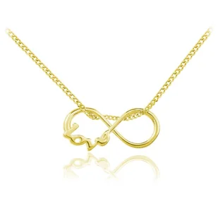 Naszyjnik Nieskończoność z napisem Love Delikatny i bardzo elegancki naszyjnik z motywem nieskończoności i napisem love. Doskonale uzupełni każdą stylizację. Idealny na gustowny i stylowy upominek. Wykonany ze srebra pr. 925 pokrtytego 24k złotem.
