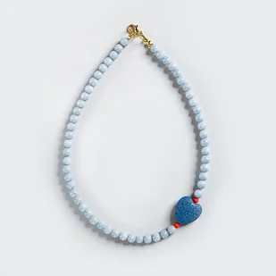 Piękny naszyjnik z kamieni naturalnych (Angelit) . Kamienie są pięknie wyszlifowane, w kolorze nieba, serducho z lawy wulkanicznej przesiaduje w towarzystwie szklanych czerwonych koralików fal ...