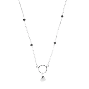 Ten delikatny naszyjnik ze srebra próby 925 urzeka nowoczesnym designem i romantycznym akcentem. Centralnym elementem jest okrągła obręcz, z której swobodnie zwisa małe serduszko – symbol miłości i bliskości. Całość uzupełniają subtelne, czarne koraliki rozmieszczone symetrycznie po bokach, dodające naszyjnikowi elegancji i lekkości. Połączenie klasycznego srebra z kontrastującą czernią sprawia, że biżuteria doskonale komponuje się z różnymi stylizacjami. Naszyjnik pięknie układa się na szyi, przyciągając wzrok i podkreślając kobiecy charakter.