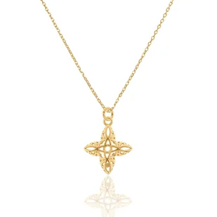 Naszyjnik srebrny pozłacany z ażurowym kwiatkiem. Całość wykonana ze srebra 925 pokrytego 24 karatowym żółtym złotem. Ażurowy kwiat: 14,0 x 16,5 mm; grubość: 4 mm Długość łańcuszka do wyboru:
