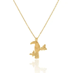 Naszyjnik srebrny pozłacany z tukanem i egzotycznymi kwiatami. Całość wykonana ze srebra 925 pokrytego 24 karatowym żółtym złotem. Tukan z egzotycznymi kwiatami: 18,7 x 15 mm Długość łańcuszka: 42 cm Grubość łańcuszka: