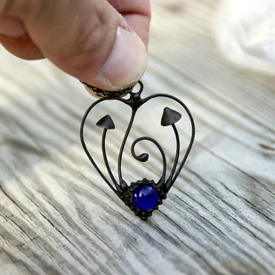 Naszyjnik Boho hippie heart z zawieszką w kształcie magicznych grzybów psilocybinowych, wykonany z miedzi, stali, cyny i niebieskiego szkła. Pokryty czarną patyną i zabezpieczony środkiem przeci ...