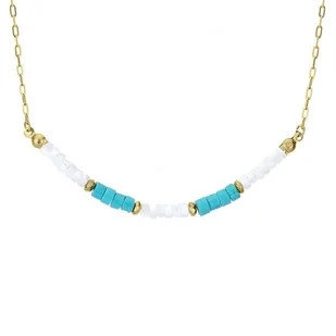 Naszyjnik choker z który łączy w sobie głębię opalizującej, białej masy perłowej z intensywnym kolorem naturalnych turkusów. Ten unikatowy naszyjnik został zaprojektowany z myślą o kobietach ceniących luksus i styl. Wykończenie najwyższej jakości nadaje naszyjnikowi luksusowy wygląd, jednocześnie zapewniając trwałość i odporność na czynniki zewnętrzne. Niezależnie od tego, czy planujesz specjalny wieczór, czy szukasz wyjątkowego dodatku do codziennego stroju, naszyjnik choker z masą perłową i turkusem jest doskonałym wyborem. Dodaj blasku swojemu wyglądowi i poczuj luksus dotyku szlachet