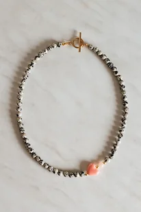 Naszyjnik wykonany z kamieni naturalnych (jaspis dalmatyński oraz jadeit) wykończony ceramicznym sercem. Złote elementy i zapięcie wykonane ze stali szlachetnej. Długość naszyjnika - 45cm Średnica kamieni ...