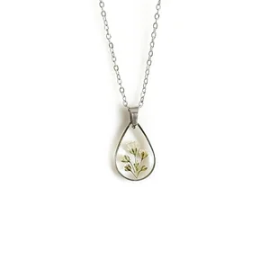 Naszyjnik wykonany ze stali szlachetnej oraz żywicy epoksydowej. Kwiaty - gipsówka Wymiary zawieszki - 2cm, o grubości około 0,2-0,3cm W zestawie łańcuszek o długości 50 cm. Biżuteria z żywicy wykonywan ...