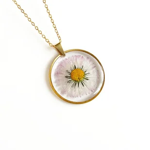 Naszyjnik wykonany ze stali szlachetnej oraz żywicy epoksydowej. Kwiaty - stokrotka Wymiary zawieszki - 3cm, o grubości około 0,2-0,3cm W zestawie łańcuszek o długości 50 cm. Biżuteria z żywicy wykonywa ...