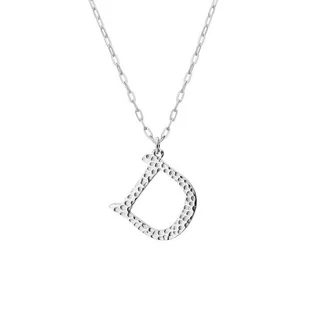 Damski naszyjnik z literką D o oryginalnej fakturze, utrzymany w minimalistycznej formie. Litera zawieszona na łańcuszku o długości 45 cm + 3 cm regulacji. Wykonany z hipoalergicznej stali szlachetnej 316L. Genialnie prezentuje się noszony wraz z innymi naszyjnikami jako naszyjnik warstwowy. Pasuje do każdej stylizacji, zarówno tej do biura, jak i na elegancką kolację.