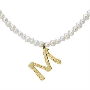 Naszyjnik z literką M z perłami hodowlanymi, pozłacany trwałą metodą PVD, która nadaje kolor 14k złota. Literka o ciekawej, oryginalnej fakturze. Naszyjnik wykończony hipoalergiczną stalą szlachetną. Minimalistyczna forma zrównoważona ponadczasową klasyką nada szyku każdej kobiecie. Biżuteria jest doskonałym pomysłem na spersonalizowany prezent dla osoby bliskiej sercu.