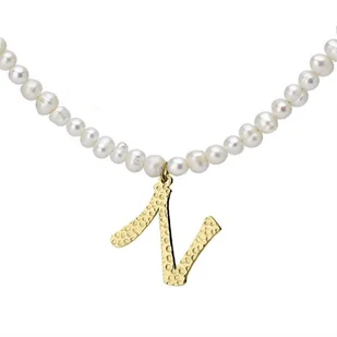 Naszyjnik z literką N z perłami hodowlanymi, pozłacany trwałą metodą PVD, która nadaje kolor 14k złota. Literka o ciekawej, oryginalnej fakturze. Naszyjnik wykończony hipoalergiczną stalą szlachetną. Minimalistyczna forma zrównoważona ponadczasową klasyką nada szyku każdej kobiecie. Biżuteria jest doskonałym pomysłem na spersonalizowany prezent dla osoby bliskiej sercu.