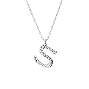 Damski naszyjnik z literką S o oryginalnej fakturze, utrzymany w minimalistycznej formie. Litera zawieszona na łańcuszku o długości 45 cm + 3 cm regulacji. Wykonany z hipoalergicznej stali szlachetnej 316L. Genialnie prezentuje się noszony wraz z innymi naszyjnikami jako naszyjnik warstwowy. Pasuje do każdej stylizacji, zarówno tej do biura, jak i na elegancką kolację.