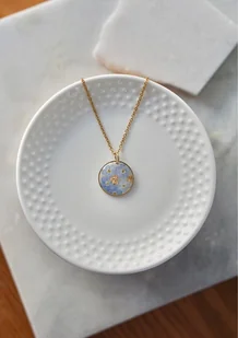 Naszyjnik wykonany ręcznie z suszonych kwiatów oraz żywicy epoksydowej. Wielkość zawieszki 20 mm. Długość łańcuszka 50 cm. Ramka oraz łańcuszek wykonane ze stali chirurgicznej w kolorze złotym. Naszyjnik pa ...