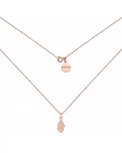 Złoty naszyjnik z liściem oraz z logo marki. Całość wykonana ze srebra 925 powlekanego 24 karatowym różowym złotem. Długość naszyjnika 45 cm Grubość łańcuszk...