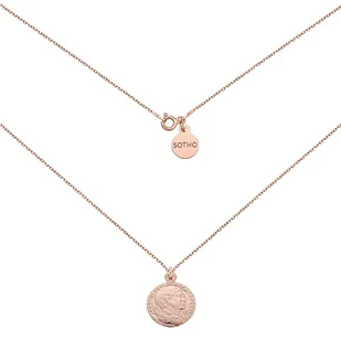 Złoty naszyjnik łańcuszkowy zdobiony monetą i zawieszką z logo marki. Całość wykonana ze srebra 925 powlekanego 18 karatowym różowym złotem. Długość naszyjnika do wyboru 38, 40, 45, 50, 60 lub 70cm Grubość łańcu ...