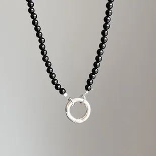 Naszyjnik ZAPIĘCIE KOŁO spinel CZERŃ kamienie naturalne czarny wykończony srebrnym zapięciem w formie koła. Naturalne kamienie w odcieniu mlecznej bieli dostępny w wersji srebrnej lub srebrne pozłac ...