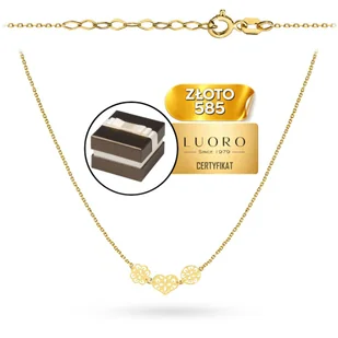 Złoty naszyjnik Luoro, Próba 585, Eleganckie ozdobne pudełko jubilerskie z satynową kokardką i welurową wkładką, Certyfikat Wyrobu Jubilerskiego w formie plastikowej karty - potwierdzający autentyczność wyrobu jubilerskiego, Oryginalna metka jubilerska, na której nie ma ceny. Idealne na prezent, Ściereczka do czyszczenia złota, aby Twoja biżuteria zawsze olśniewała, Naklejka informująca, jaka próba złota została wykorzystana do produkcji naszyjnika. Zgodnie z obowiązującymi w Polsce przepisami, wyroby ze złota o wadze powyżej 1g oznaczone są odpowiednią cechą probierczą nadaną przez Okręgowy Urząd Probierczy, co potwierdza i gwarantuje autentyczność złota. Odkryj magię złotego naszyjnika z ażurowym sercem, kwiatem i delikatnym kółkiem – symbolami, które ożywiają każdy Twój ruch wyjątkowym blaskiem i subtelną elegancją. Ta finezyjna, złota celebrytka zachwyca precyzją wykonania i szlachetnością żółtego złota, które emanuje ciepłem i luksusem, podkreślając unikalność każdej chwili.
