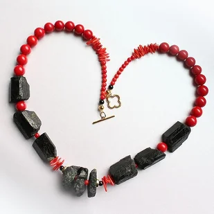 Amulet - Wolność i ochrona Autorski energetyczny naszyjnik wykonany ręcznie z surowych czarnych turmalinów, czerwonych korali, onyksów i hematytów pozłacanych 24k złotem. Ozdobiony efektownym zapięci ...