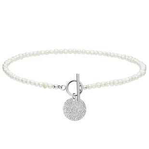Choker z subtelnych pereł hodowlanych w kolorze białym. Zapięcie typu toggle, wykonane ze stali szlachetnej, nadaje biżuterii wyjątkowego charakteru. Ozdobione zostało medalionem o ciekawej fakturze. Minimalistyczna forma zrównoważona ponadczasową klasyką nada szyku każdej kobiecie. Perły są symbolem piękna, doskonałości oraz skromności, nazywane często "łzami aniołów".