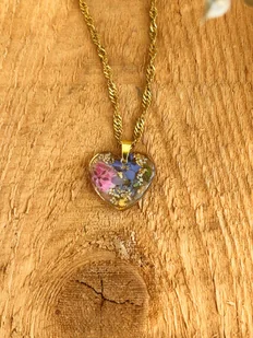 Ten naszyjnik to małe serce, które zatrzymało w sobie kawałek lata — prawdziwe, suszone kwiaty zamknięte w przejrzystej żywicy mienią się delikatnie w świetle, tworząc wyjątkową kompozycję barw i wspomnień. Każ ...