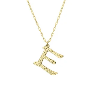 Damski naszyjnik z literką E o oryginalnej fakturze, utrzymany w minimalistycznej formie. Litera zawieszona na łańcuszku o długości 45 cm + 3 cm regulacji. Wykonany z hipoalergicznej stali szlachetnej 316L. Pozłacany innowacyjną i trwałą metodą PVD. Genialnie prezentuje się noszony wraz z innymi naszyjnikami jako naszyjnik warstwowy.