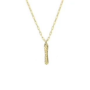 Damski naszyjnik z literką I o oryginalnej fakturze, utrzymany w minimalistycznej formie. Litera zawieszona na łańcuszku o długości 45 cm + 3 cm regulacji. Wykonany z hipoalergicznej stali szlachetnej 316L. Pozłacany innowacyjną i trwałą metodą PVD. Genialnie prezentuje się noszony wraz z innymi naszyjnikami jako naszyjnik warstwowy.