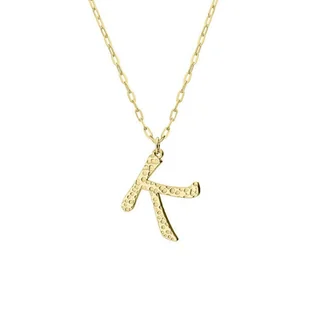 Damski naszyjnik z literką K o oryginalnej fakturze, utrzymany w minimalistycznej formie. Litera zawieszona na łańcuszku o długości 45 cm + 3 cm regulacji. Wykonany z hipoalergicznej stali szlachetnej 316L. Pozłacany innowacyjną i trwałą metodą PVD. Genialnie prezentuje się noszony wraz z innymi naszyjnikami jako naszyjnik warstwowy.