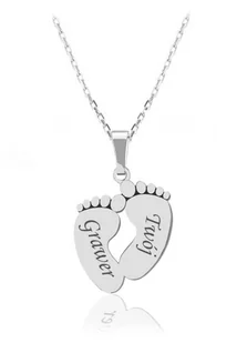Srebrny naszyjnik z dziecięcymi stópkami Dane produktu: materiał: srebro pr. 925 wymiary samych stópek: ok. 1,9 x 1,5 cm łańcuszek o splocie do wyboru - ankier lub pancerka łańcuszek ma grubośc ok. 1,1 mm Grawerunek: do ok. 15 znaków na jednej stópce jeśli któraś stópka lub całość ma pozostać bez graweru prosimy o wpisanie w oknie "treść graweru" słowa "bez graweru" do wyboru 4 rodzaje czcionek - w przypadku większej ilości znaków sugerujemy wybór uniwersalnej lub klasycznej w razie pytań lub wątpliwości odnośnie graweru - treści, ilości znaków czy kroju czcionki - skontaktuj sie z nami.