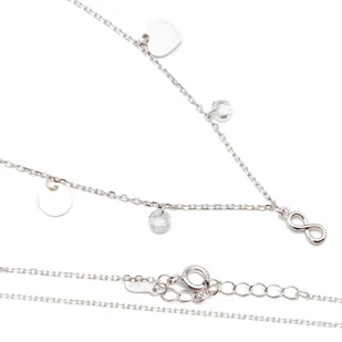 Srebrny naszyjnik z motywem nieskończoności, zawieszkami z białą cyrkonią i łańcuszkiem o klasycznym splocie typu ankier. Wykonany z najwyższej jakości lśnią...