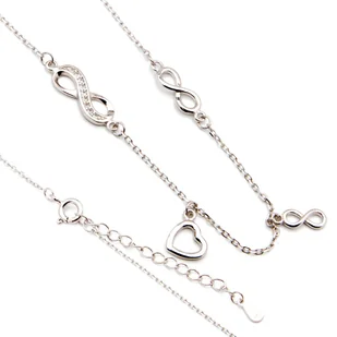 Srebrny naszyjnik z zawieszkami z motywem serca i nieskończoności. Wykonany z najwyższej jakości lśniącego srebra próby 925. Fabrycznie nowy. Naszyjnik ma mo...