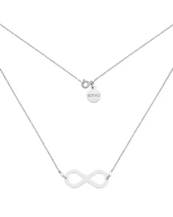 Srebrny naszyjnik łańcuszkowy zdobiony dużą nieskończonością i zawieszką z logo marki. Całość wykonana ze srebra 925. Długość naszyjnika ok 42,5 cm. Grubość ...