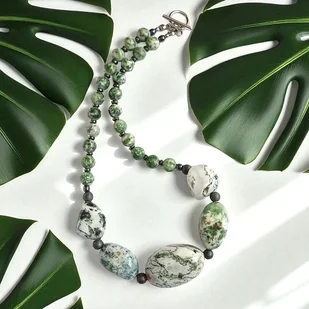 Unikat Unikatowy naszyjnik na solidnej lince stalowej (miękkiej) - został wykonany z komponentów, tworzących spójną, niezwykle efektowną całość. W roli głównej: agat mszysty - nieregularne, polerowane ...