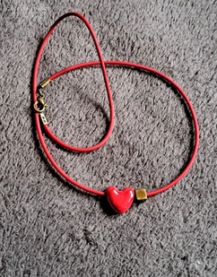 Delikatny, efektowny, niewielki (ok.1,5 cm) wisiorek w kształcie cudnego serduszka z pięknej ceramiki w bosko czerwonej tonacji, dodatkowo ozdobiony kubikiem z mosiądzu. Zawieszony na czerwonym, do ...