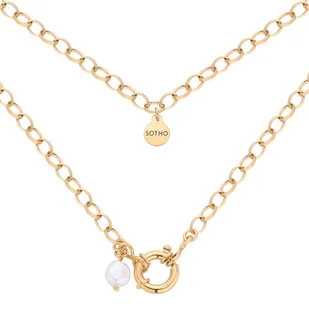 Złoty masywny naszyjnik z ozdobnym zapięciem i naturalną perłą oraz zawieszką z logo marki. Całość wykonana ze srebra 925 powlekanego 24 karatowym żółtym zło...