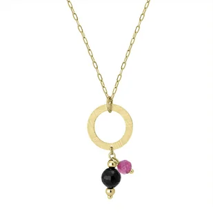 Subtelny naszyjnik koło o drapanej strukturze z naturalnymi kamieniami. Centralnym punktem naszyjnika jest wisiorek koło, który symbolizuje harmonię i nieskończoność. Ten minimalistyczny lecz bogaty w symbolikę detal jest dodatkowo podkreślony przez dwa małe lecz wyraziste kamienie szlachetne: turmalin i cytryn. Żółty cytryn dodaje szlachetnego charakteru, tworząc wyrafinowany kontrast z czarnym turmalinem.
