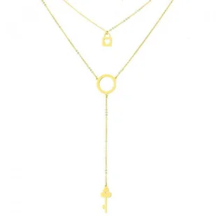 Ozdobiony jest elementami w kształcie kluczyka, kłódki i kółeczka symbolizującego karmę - powracające dobre i zło. Całość wykonano ze hipoalergicznej stali szlachetnej. Biżuteria pokryta jest powłoką PVD, która nadaje trwały kolor złota.