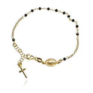 Srebrna bransoletka pozłacana różaniec z medalikiem i krzyżykiem, czarne cyrkonie