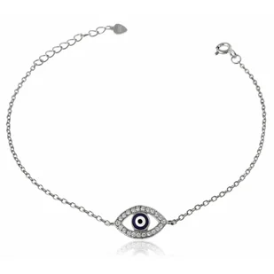 Bransoleta oko proroka Nazar srebro 925 Amulet talizman ochronny Opis produktu: Bransoletka srebrna z motywem oka to nie tylko elegancka ozdoba, ale także silny talizman ochronny. Centralna zawieszka w kształcie oka, wysadzana drobnymi cyrkoniami, nawiązuje do symbolu „evil eye” – znanego w wielu kulturach jako amulet chroniący przed negatywną energią i złym spojrzeniem. Wykonana ze srebra próby 925, z regulowanym łańcuszkiem i zawieszką w kształcie serduszka, zapewnia komfort noszenia i perfekcyjne dopasowanie. Idealna dla osób ceniących biżuterię o głębokim znaczeniu i subtelnym blasku.