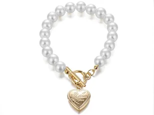 Modna bransoletka z białymi, perłowymi kuleczkami oraz dużym sercem, na którym została wygrawerowana róża oraz napis I LOVE YOU. Platerowane metalem w odcieniu żółtego złota Parametry: Długość ok: 21,0 cm Średnica kuleczki ok: 0,9 cm Wielkość serca ok: