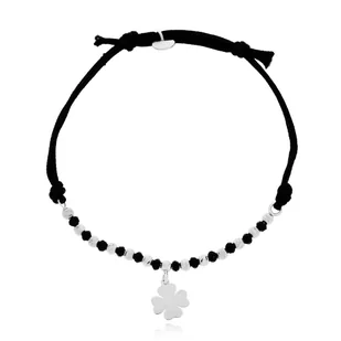 Bransoletka czarny sznurek koniczynka, kulki, kółko srebro pr. 925