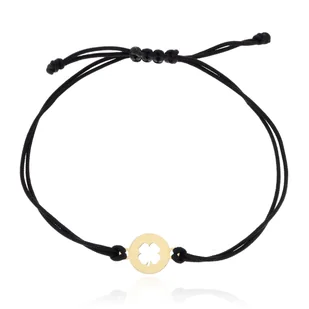 Bransoletka sznurek, próba złota 585 Symbol: koniczynka Średnica kółka: 10.0 mm Waga: ok. 0.23 g Kolor sznurka: czarny Regulowana długość