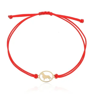 Bransoletka sznurek, próba złota 585. Rodzaj: Sznurek Próba złota: 585 Symbol: Piesek Wymiary zawieszki [mm]: ok. 15.0 x 9.0 Waga: ok. 0.19 g Kolor sznurka: Czerwony Długość regulowana