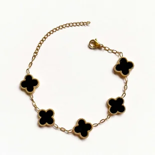 Bransoletka damska czarna czterolistna koniczynka ze stali chirurgicznej Długość bransoletki: 21 cm (w tym 4 cm regulacji)Surowiec: stal szlachetnaKolor koniczynki: czarnyKolor surowca: złotyRodzaj zapięcia: