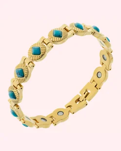 in. uspokajające i odprężające. Turkusy w tym modelu bransoletki zostały oszlifowane w kształcie rombów. Model tej biżuterii zapinany jest na wygodne zapięcie zatrzaskowe. Nowoczesne wzornictwo sprawia, że damska bransoletka magnetyczna będzie idealnym dodatkiem zarówno do codziennych jak i bardziej okazjonalnych stylizacji. Turkusowy kolor kamieni oraz pozłacana stal tworzą doskonały duet, który z pewnością przyciągnie niejedno spojrzenie.