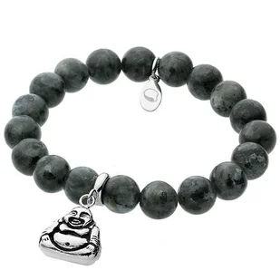 Niezwykła bransoletka damska idealna dla kobiet zafascynowanych kulturą buddyjską. Wykonana jest z naturalnych kamieni - szarego larvikitu, który według wierzeń, przynosi jedność myśli oraz wspiera kreatywność. Design biżuterii wzbogacono stalową ozdobą przedstawiającą wizerunek Buddy. Kamienie umieszczone są na elastycznej i wytrzymałej gumce silikonowej, która idealnie dopasowuje się do obwodu nadgarstka. Każda zamawiana biżuteria z kamieni naturalnych jest jedyna w swoim rodzaju i może nieco różnić się kolorem od prezentowanej na zdjęciach.