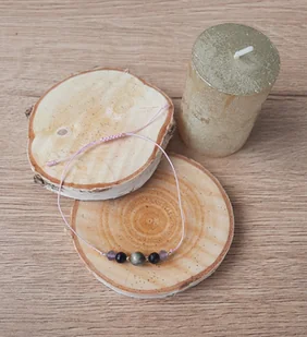 Ręcznie wykonana bransoletka na różowym sznureczku (0,8 mm) z naturalnym Fluorytem, Czarnym Turmalinem i Okiem Orła. ✨ Fluoryt wspiera koncentrację, pomaga w...