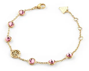 OPIS SZCZEGÓŁOWY ➡️ WYKONANIE Damska platerowana pozłacana bransoletka ze stali nierdzewnej pokryta odporną na ścieranie powłoką w kolorze żółtego złota. Charms w kształcie koła z logo 4G. Zdobiona szklanymi cyrkoniami w kolorze fuksja ➡️ DŁUGOŚĆ 14,5 - 18,5 cm ➡️ ZAPIĘCIE Typu karabińczyk, regulowane, zakończone trójkątem z logo