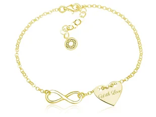 Srebrna bransoletka Infinity i Serca wykonana ze srebra pr. 925 pokryta 24k złotem. Delikatny łańcuszek z symbolem nieskończoności i blaszką pod grawer w kształcie serduszka. Naszą biżuterię zawsze pakujemy w ozdobne pudełeczko jubilerskie. Każdy wyrób posiada metkę jubilerską.
