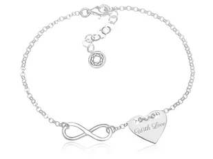 Srebrna bransoletka Infinity i Serca wykonana ze srebra pr. 925. Delikatny łańcuszek z symbolem nieskończoności i blaszką pod grawer w kształcie serduszka. Naszą biżuterię zawsze pakujemy w ozdobne pudełeczko jubilerskie. Każdy wyrób posiada metkę jubilerską. Symbol nieskończoności Symbol odwróconej ósemki symbolizuje trwałość, wierność i nieskończoność.